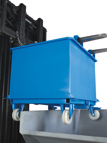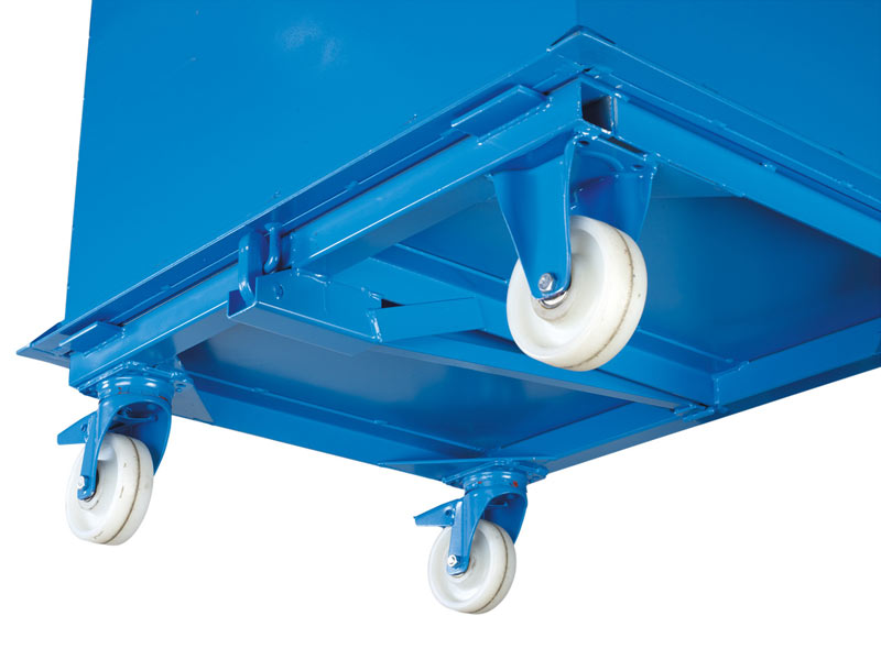 - Mit Stapler oder Hubwagen aufnehmbar oder verfahrbar mit Bock- und Lenkrollen.