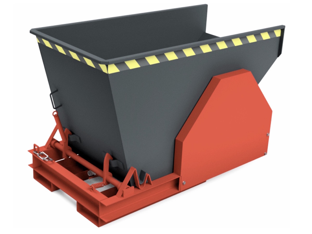 Der große Kippbehälter mit dem Schutz der Abrollkufen. Die Kipplore findet im Arbeitsalltag viele Einsätze ob als Kipp- und Transportwagen für Abfälle wie Schrott sowie für schüttbare Materialien wie Kleinteile oder Späne.