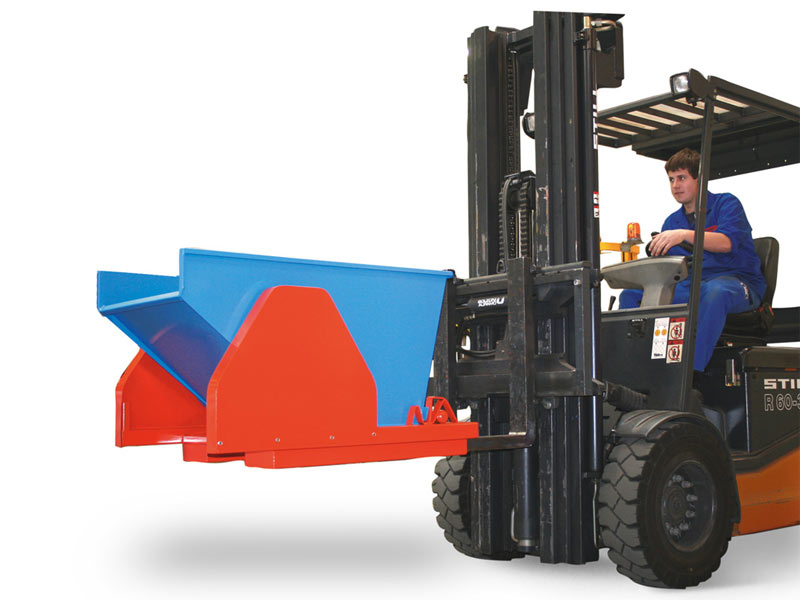- Durch die Abrollkufen entsteht beim Entleervorgang kein Schlag auf das Hubgerüst des Staplers