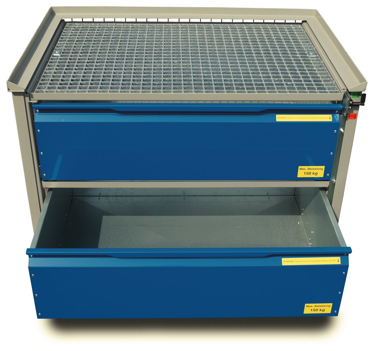 - Die robuste Schwerlastausführung hält höchsten Ansprüchen genüge. An mehreren Punkten ist der Gitterrahmen fest mit der inneren Struktur verbunden, die so auch bei maximaler Belastung die Funktion der Schubladen gewährleistet.