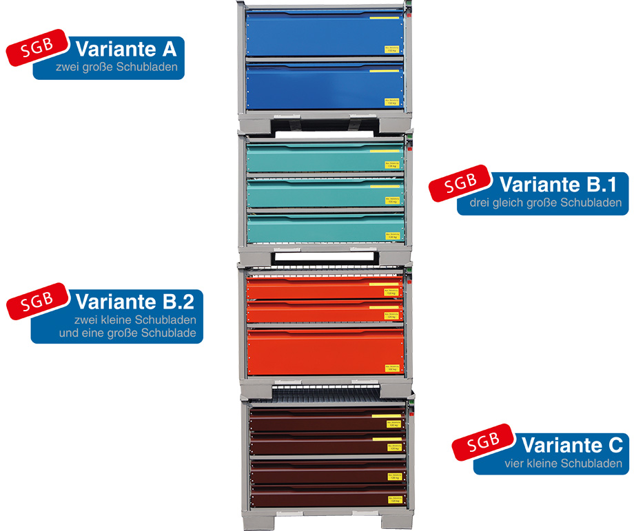 Entdecken Sie den neuen intelligenten innerbetrieblichen Ladungsträger SGB. Egal, ob Sie eine Werkbank mit Werkschrank, ein Taktgestell oder eine neue Kommissionierbox suchen. Die System-Gitterbox SGB können Sie in die verschiedensten Produktionsschritte Ihres Unternehmens mit einbeziehen. Mit standardisierten Palettenmaßen stapeln Sie bis zu fünf Gitterboxen in die Höhe, jederzeit, überall, immer anders!
