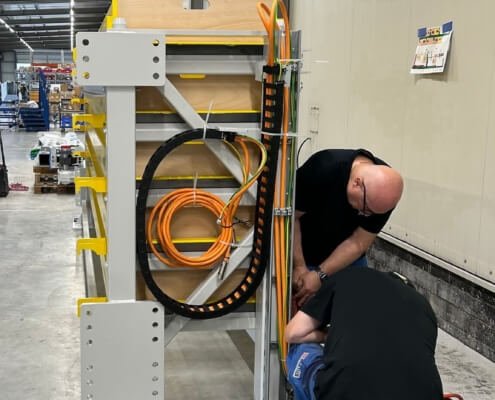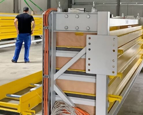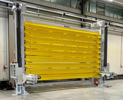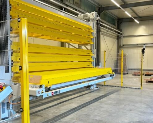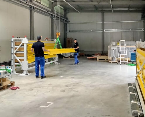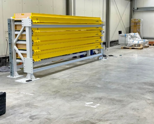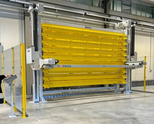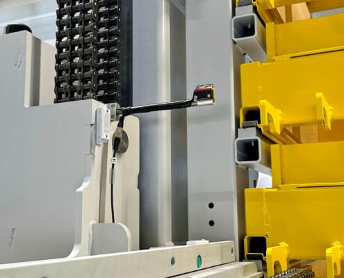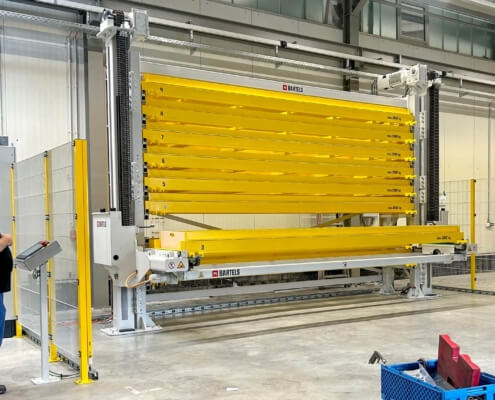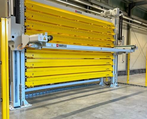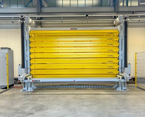 Der Automatik-Tower von Bartels wird künftig zwei CNC-Stanzmaschinen mit Material versorgen, welche links und rechts der Lagerlösung platziert werden. Eine erste Maschine, die ursprünglich in einer benachbarten Fertigungshalle stand, ist kurz nach der Installation des Towers umgezogen und in Betrieb genommen worden. In wenigen Wochen wird dann eine zweite Maschine das Ensemble komplettieren. Beide Maschinen werden dann aus dem Tower mit Kupferschienen versorgt, so dass der Workflow im Werk optimal gefördert wird.