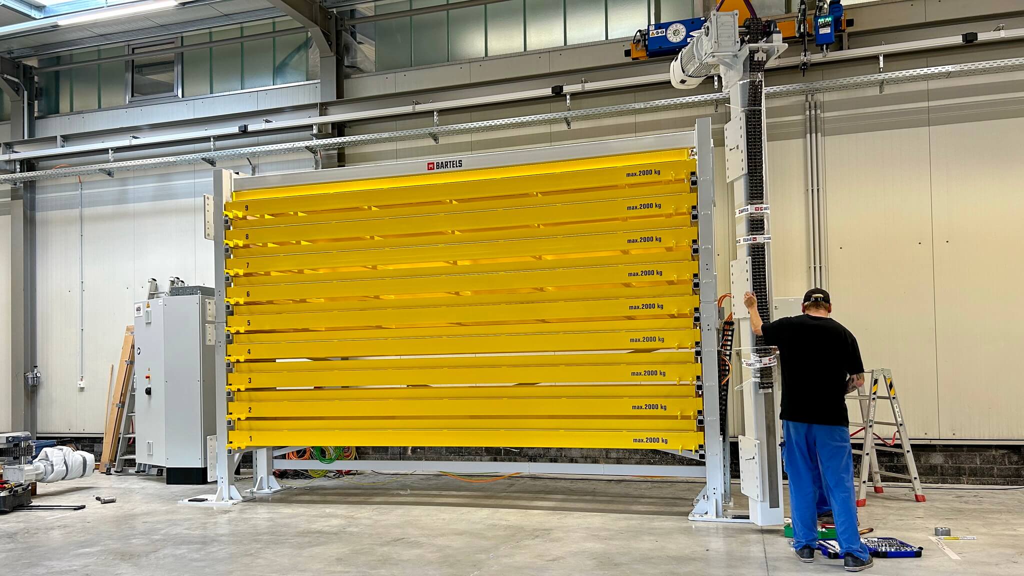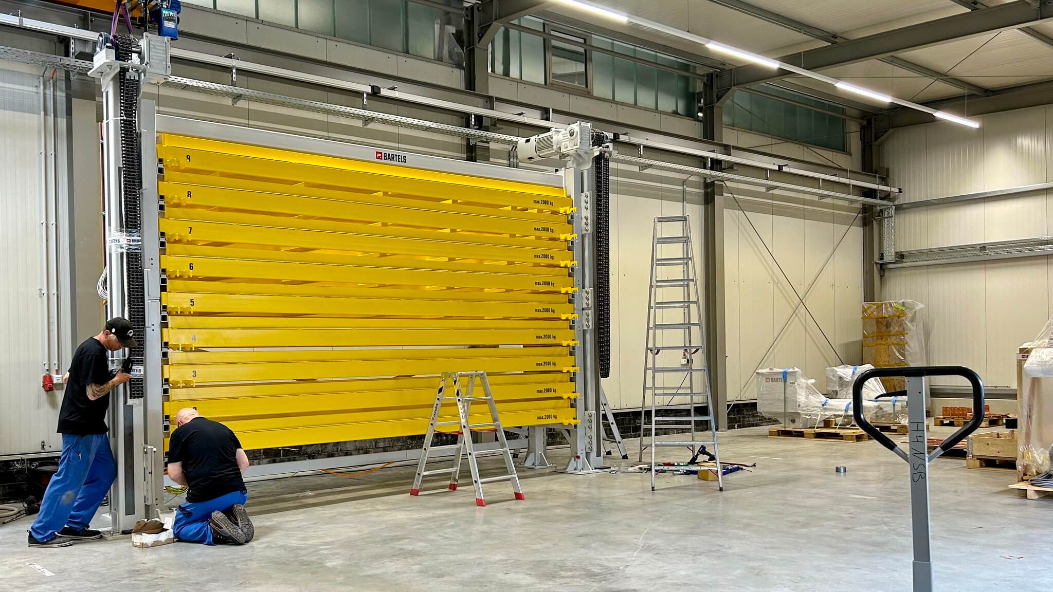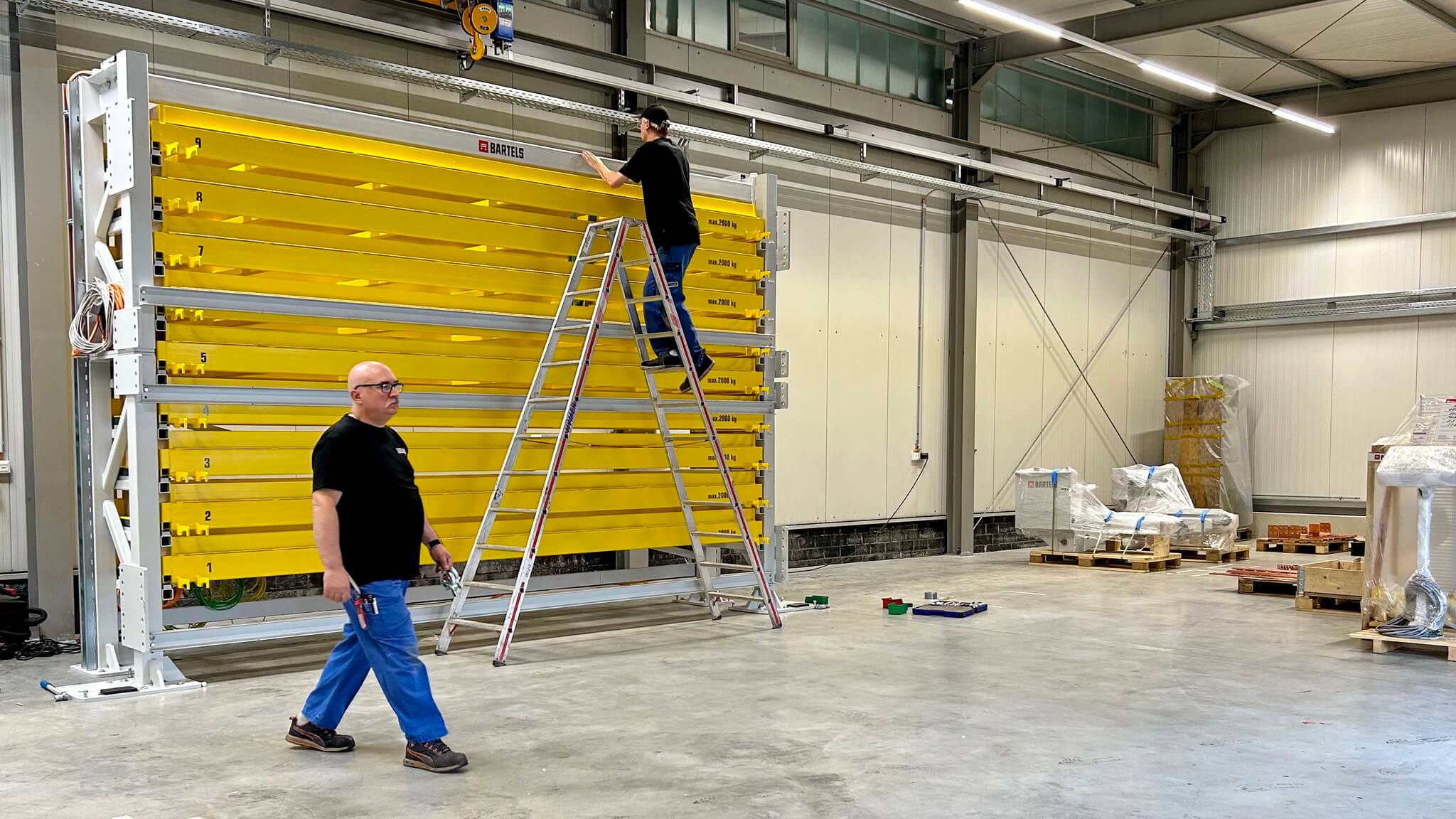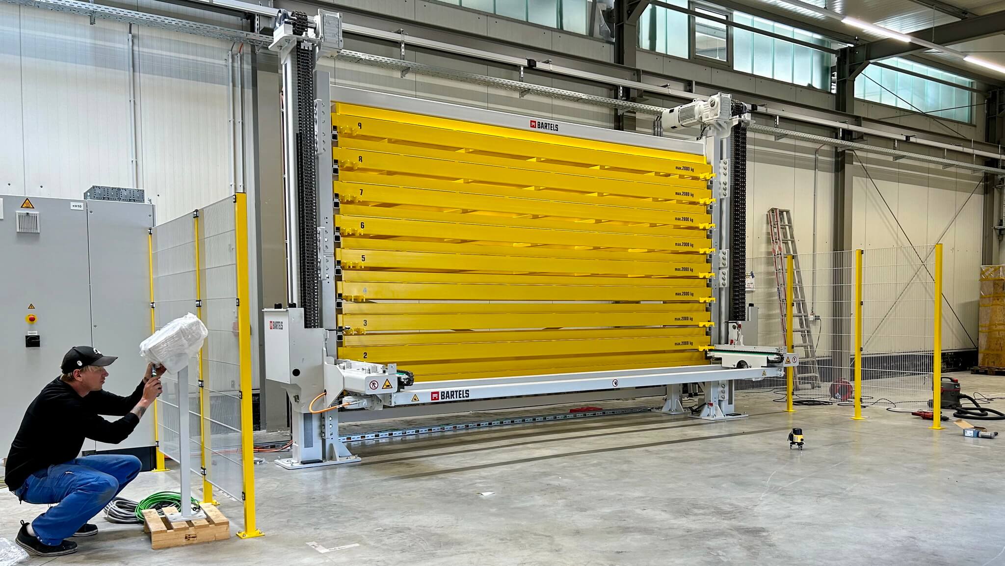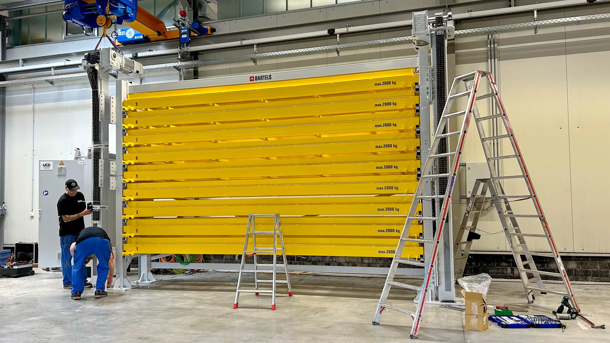 Im Juli 2025 hat Bartels seinen neuen Automatic-Tower erstmals bei einem Kunden installiert. Am Stammsitz der Gräper Gruppe in Ahlhorn bei Bremen wurde die vollautomatische Regallösung in einer maßgeschneiderten Version für Langgut aufgebaut. Und das in Rekordzeit. Der Aufbau der Stahlkonstruktion, die Verlegung von Kettenzügen und Kabeln, die Installation von Schaltschrank und Bedienpanel sowie die technische Abnahme und Inbetriebnahme erforderten lediglich zweieinhalb Arbeitstage.