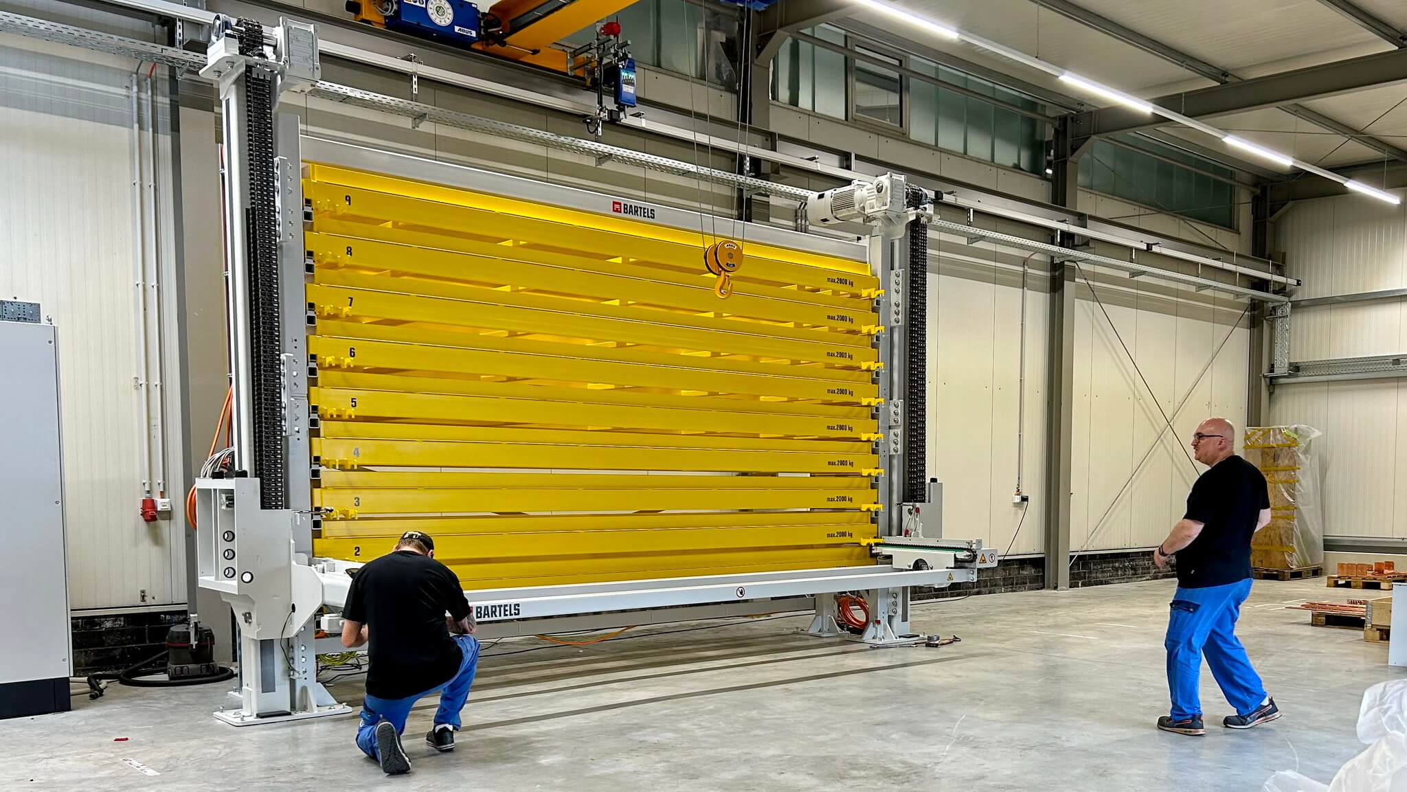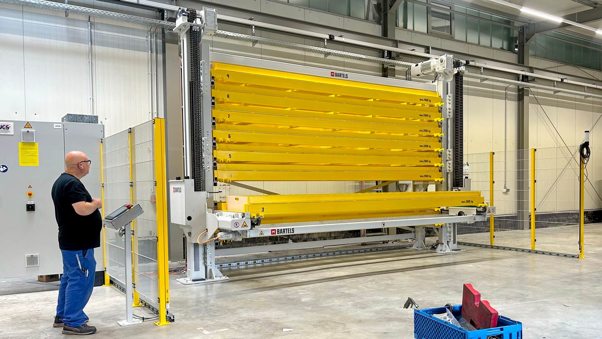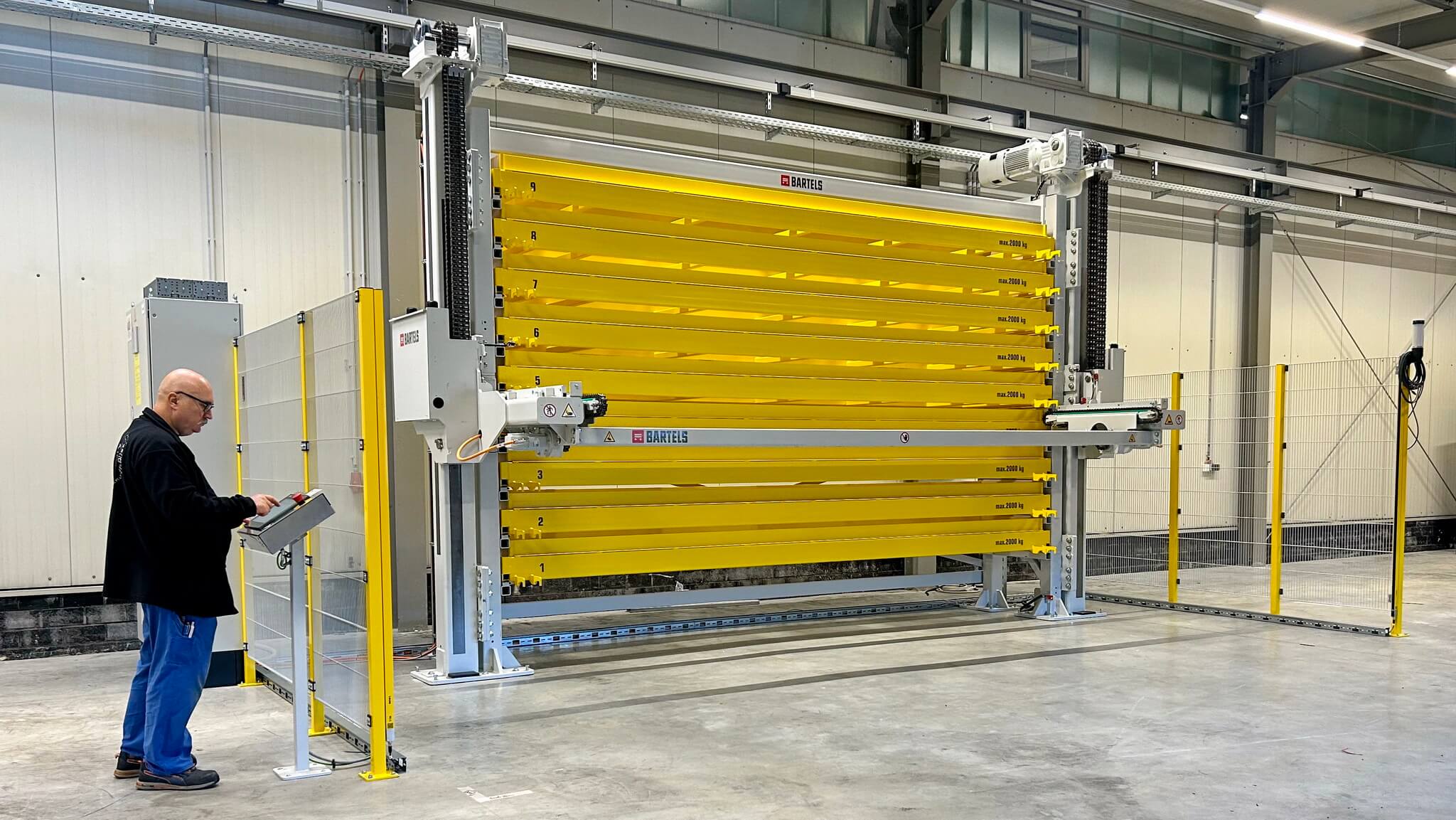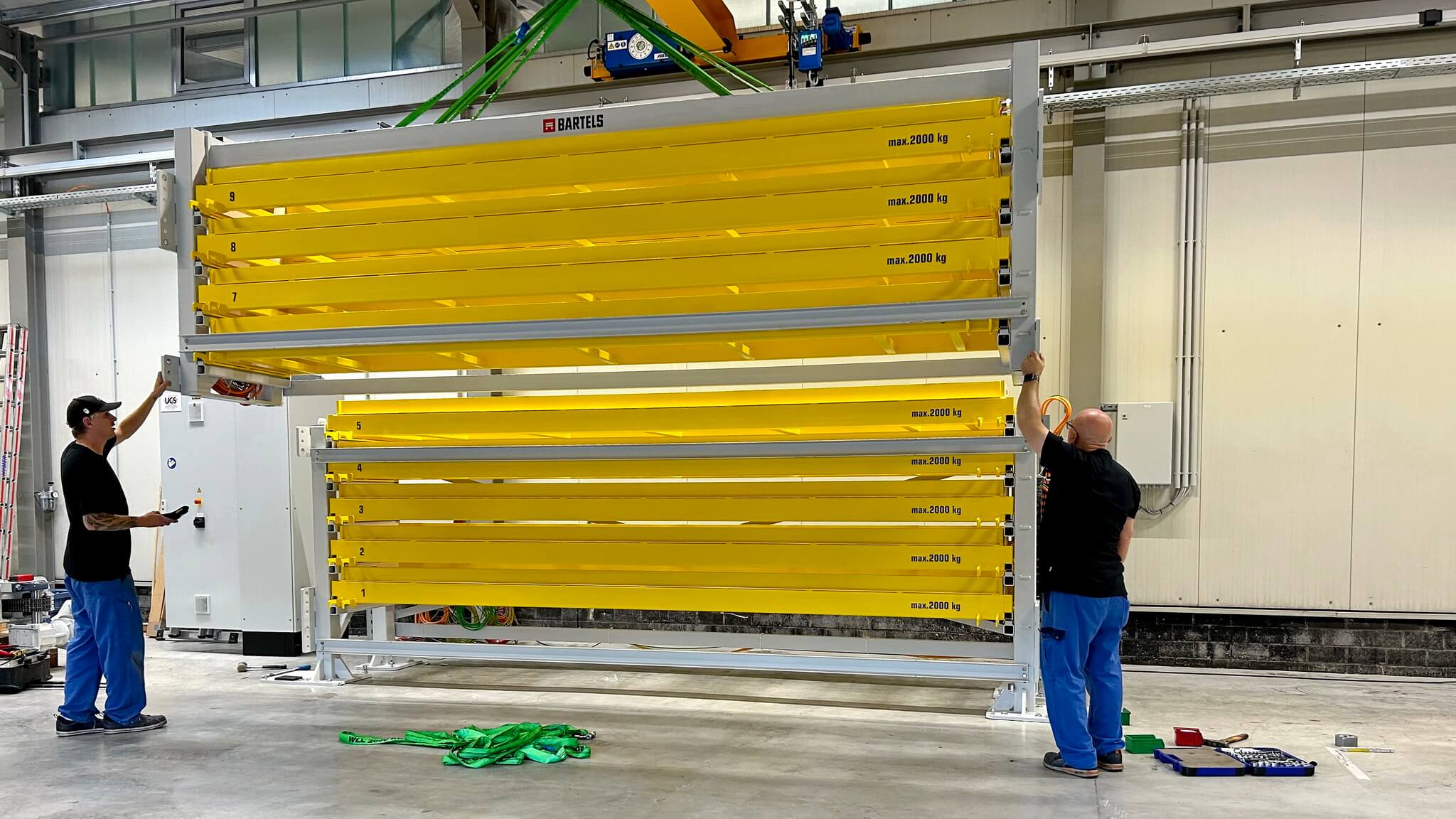 Im Juli 2025 hat Bartels seinen neuen Automatic-Tower erstmals bei einem Kunden installiert. Am Stammsitz der Gräper Gruppe in Ahlhorn bei Bremen wurde die vollautomatische Regallösung in einer maßgeschneiderten Version für Langgut aufgebaut. Und das in Rekordzeit. Der Aufbau der Stahlkonstruktion, die Verlegung von Kettenzügen und Kabeln, die Installation von Schaltschrank und Bedienpanel sowie die technische Abnahme und Inbetriebnahme erforderten lediglich zweieinhalb Arbeitstage.