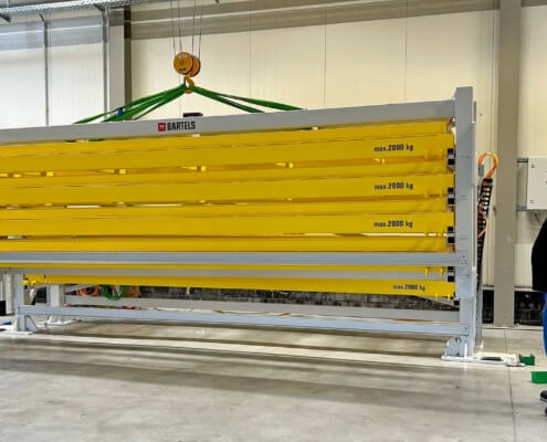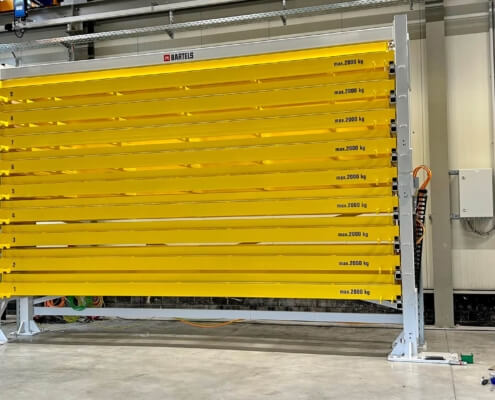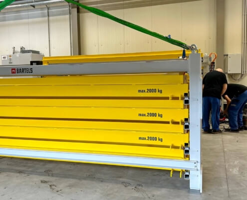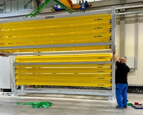 „Ursprünglich hatten wir mit drei vollen Tagen gerechnet“, berichtet Nils Niendorf, Fertigungsleiter der Karl H. Bartels GmbH, der mit zwei Kollegen für die Montage vor Ort war. „Da alles gut vorbereitet war und uns der Kunde optimal unterstützt hat, hat alles sehr gut geklappt und wir waren etwas früher fertig.“ Vor der Auslieferung an Gräper hatte das Bartels-Team den maßgeschneiderten Tower mit den gelb lackierten Ladungsträgern in seinem Werk im schleswig-holsteinischen Horst bei Elmshorn einmal probeweise aufgebaut.