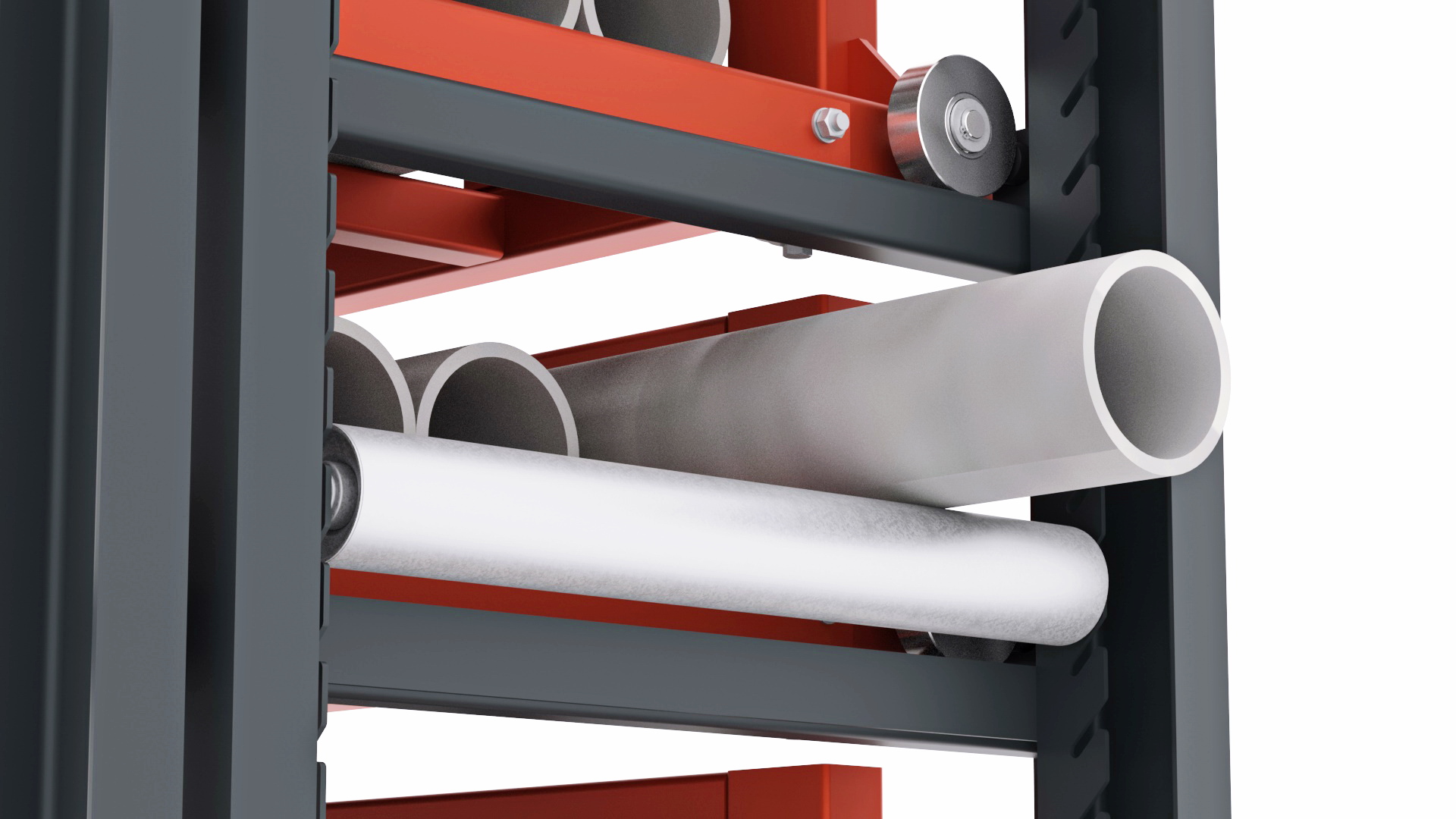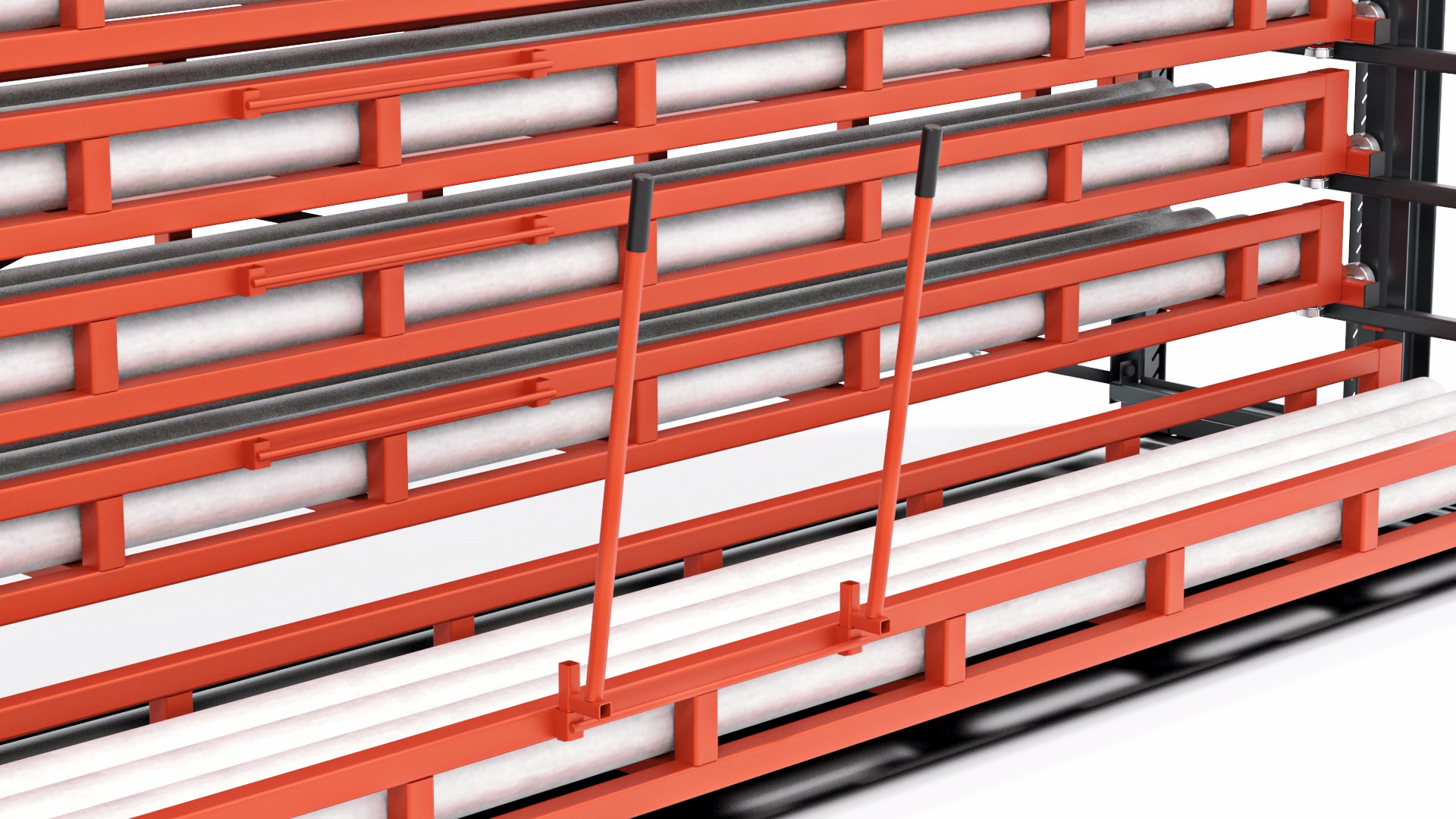 Für die leichte Entnahme des Strangmaterials von den Stirnseiten aus, auch bei geschlossenem Vorbau des Kassetten-Schubfachregals wird einfach eine Abrollwalze eingesteckt, über die sich das Stabstahl leicht herausziehen lässt.